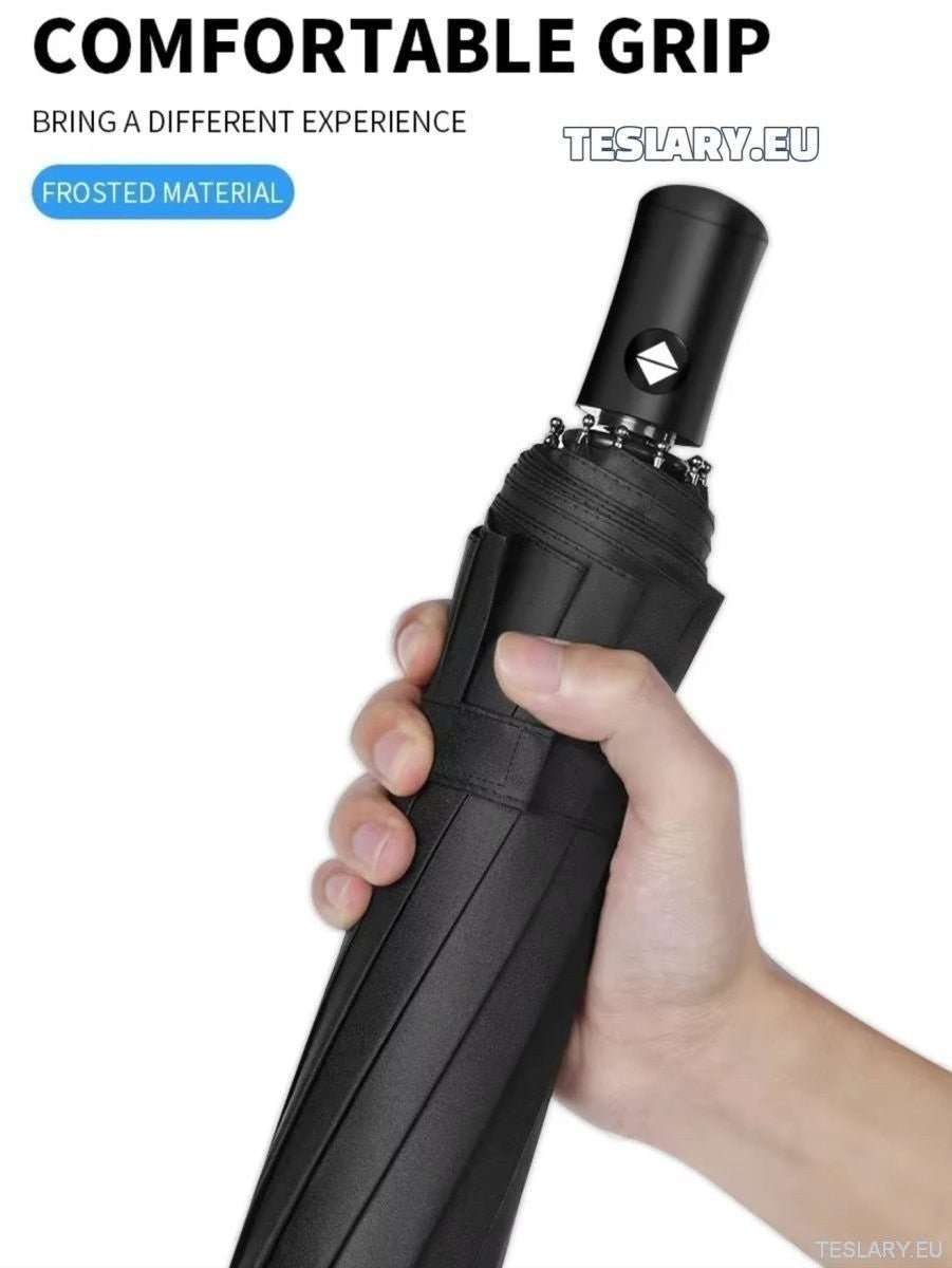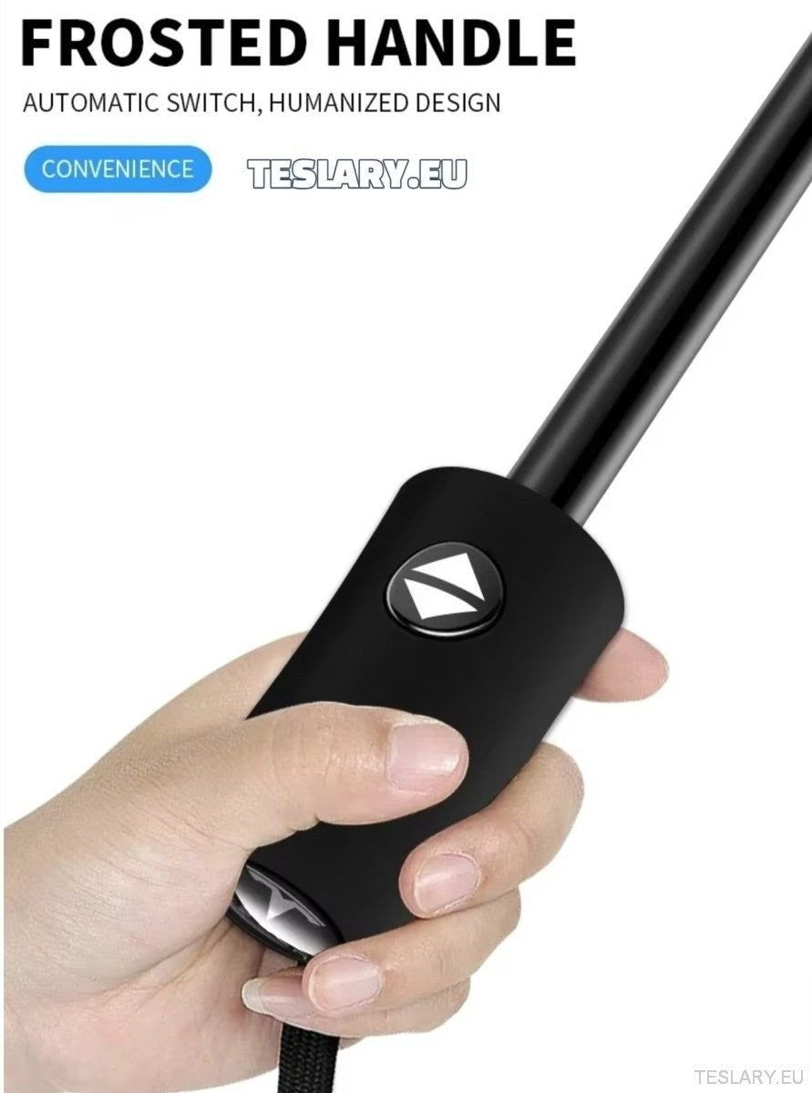 The Black Wind & Rain Resistant Umbrella with Tesla Logo is designed for effortless use, featuring an innovative mechanism that allows easy opening and closing even in confined spaces, unlike traditional umbrellas. This user-friendly design enhances convenience during crowded commutes or tight indoor areas, reducing hassle and improving efficiency. Built with durable, wind-resistant materials and a waterproof canopy, it offers reliable protection against harsh weather conditions. The sleek black finish, accented by the iconic Tesla logo, combines practicality with a refined aesthetic. Compact and lightweight, this umbrella is an expert choice for those seeking advanced functionality and sophisticated style in all environments.
