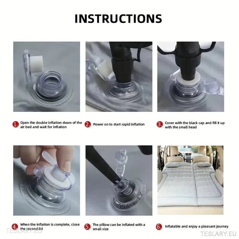 4. Rapid inflation and deflation: The airbags on both sides can be quickly inflated or deflated to the required firmness within minutes. Hardness can be adjusted according to your needs. To eat the mattress, simply plug the pump into your car's cigarette lighter socket and pump air through the nozzle through the mattress.