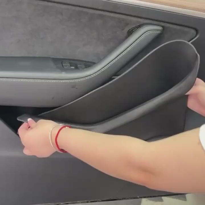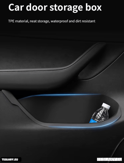Waterproof Door Pocket Protective Organisers which are easy to install and easy to remove so you can clean the storage pockets within the doors of your Tesla. Made from High Quality Robust and Flexible TPE Plastic Material these protective pockets will ensure the carpeted area of your original door pockets does not come into contact with anything you store in the pockets and are easily removed to be cleaned. These pockets are customers designed for each model of the Tesla Range ensuring a snug fit for your Tesla Model 3 , Model 3 + Highland or your Tesla Model Y. On top of all of this the pockets are waterproof so should you spill water or a soft drink into the storage pocket you can easily remove the pocket pour the liquid out , clean the pocket and then refit without there being any damage or staining to the original carpeted area of the Tesla.