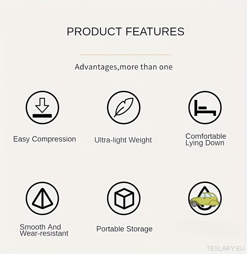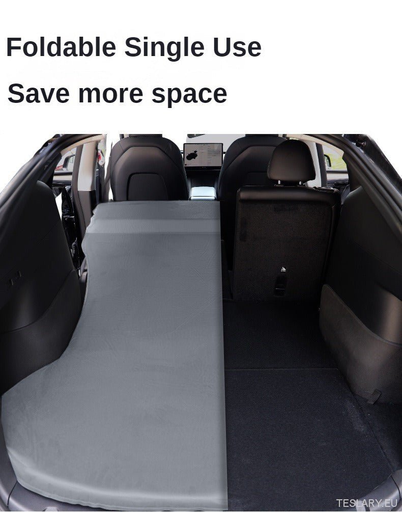 The Automatic Inflatable Camping Mattress is expertly designed to fit Tesla Model 3, Model Y, Model 3+ Highland, and Model Y+ Juniper models with the rear seats folded down, ensuring a perfect fit that maximizes available space. Crafted for optimal comfort, it includes matching pillows to enhance your sleeping experience during camping or long trips. The mattress inflates automatically for quick setup and deflates just as easily for compact storage. Its durable materials provide reliable support and comfort, while the included packing bag fits conveniently in the Frunk or lower rear trunk compartment, making it an essential accessory for Tesla owners seeking convenience and comfort on the road.