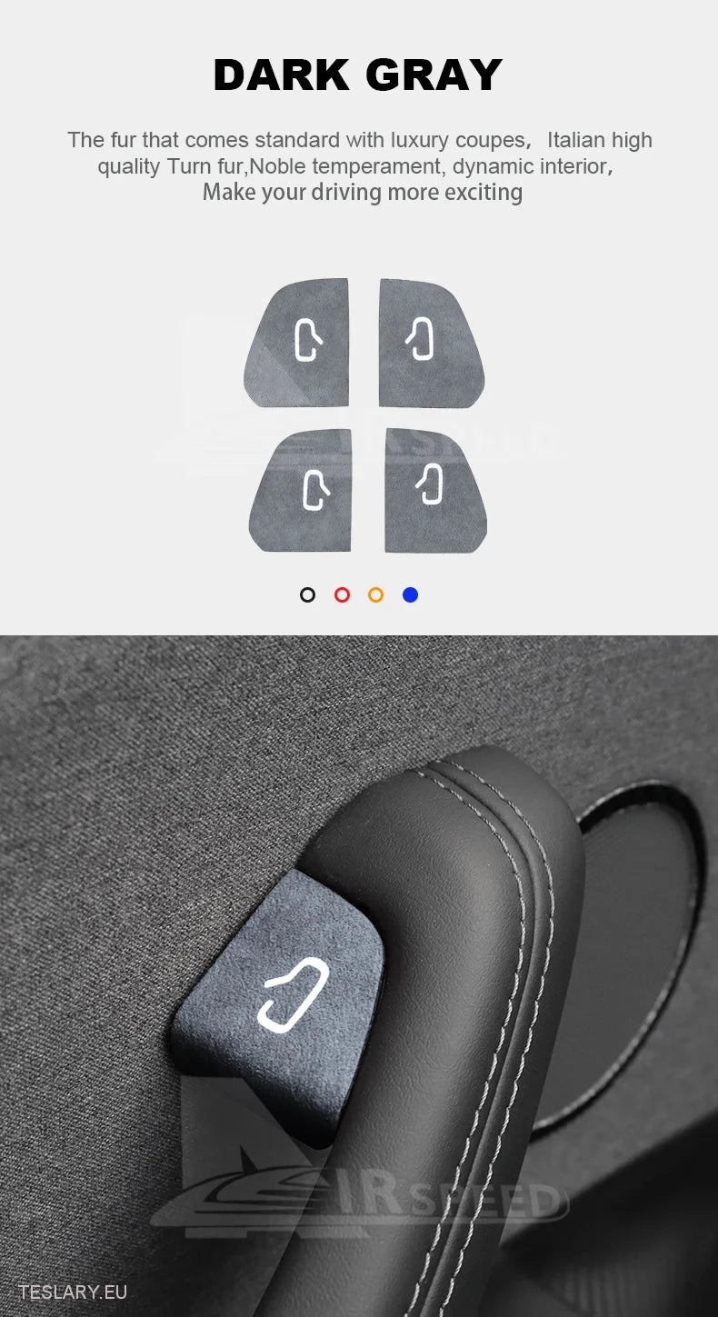 Protect and elevate your Tesla Model 3 Highland and Model Y Juniper interiors with these Italian Alcantara suede button covers, designed specifically for your window and door opening switches. Crafted from high-quality Alcantara, these covers guard against everyday wear and tear while adding a sophisticated, tactile upgrade to your vehicle’s cabin. Installation is quick and effortless, taking less than five minutes, with a precise fit that ensures seamless integration with your Tesla’s design. This expert accessory not only preserves your interior’s pristine condition but also enhances its luxurious appeal, making every drive a refined experience.