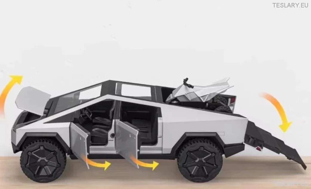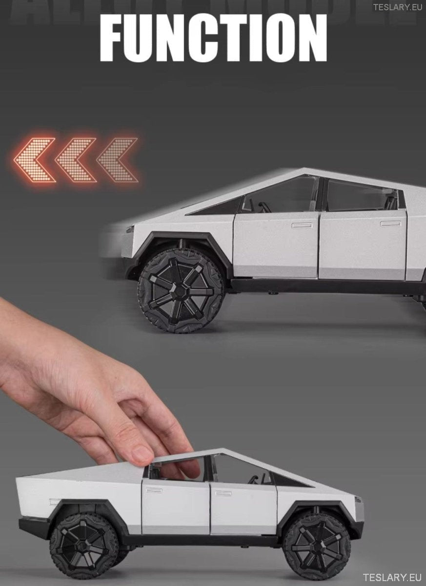 - Crafted with precision, the model features a striking alloy body that replicates the Cybertruck's distinctive angular silhouette