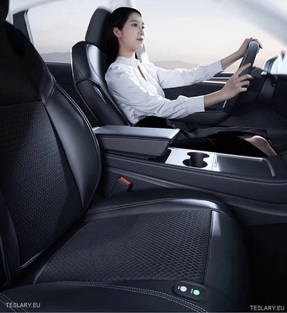 Experience enhanced comfort in your Tesla Model 3 or Model Y with this premium ventilated seat cover, crafted from high-quality black or white PU leather. Featuring a diamond mesh design, the cover integrates nearly silent fans that deliver three adjustable cooling levels, ensuring personalized temperature control. Utilizing advanced condensing technology, it optimizes power consumption while providing comprehensive cooling across your entire body. Additionally, active noise reduction minimizes fan sound, maintaining a quiet cabin environment. This single-piece seat cover combines sophisticated materials and innovative engineering to elevate your driving experience with effective, discreet ventilation.